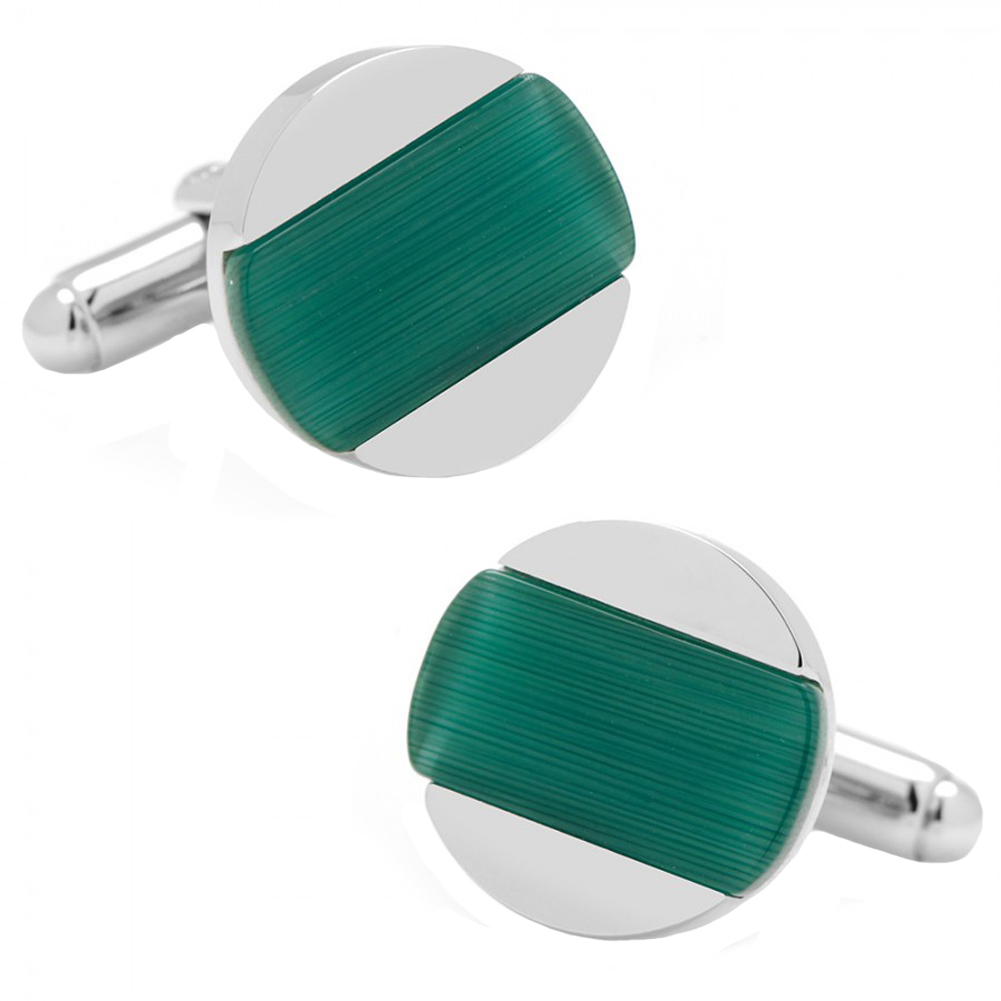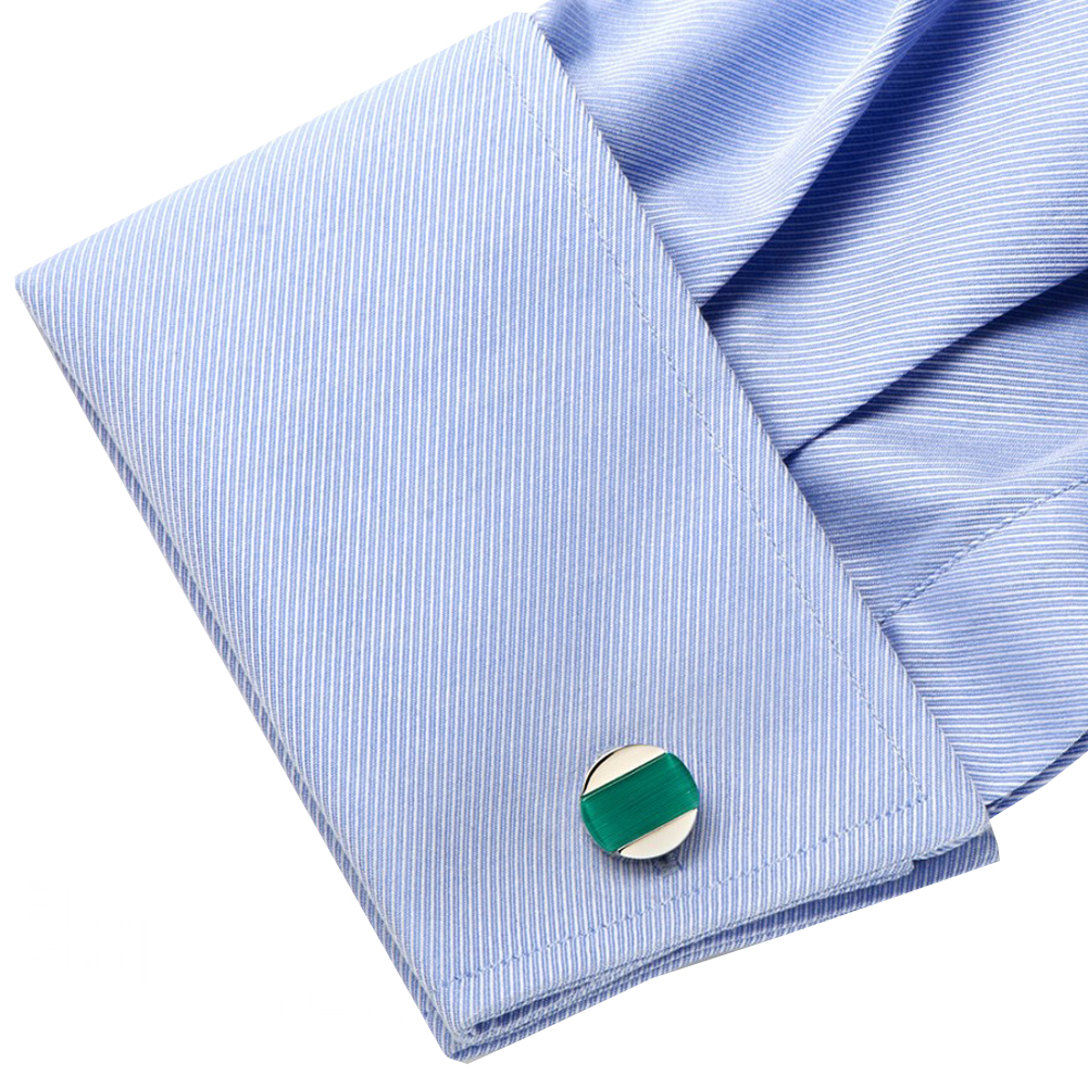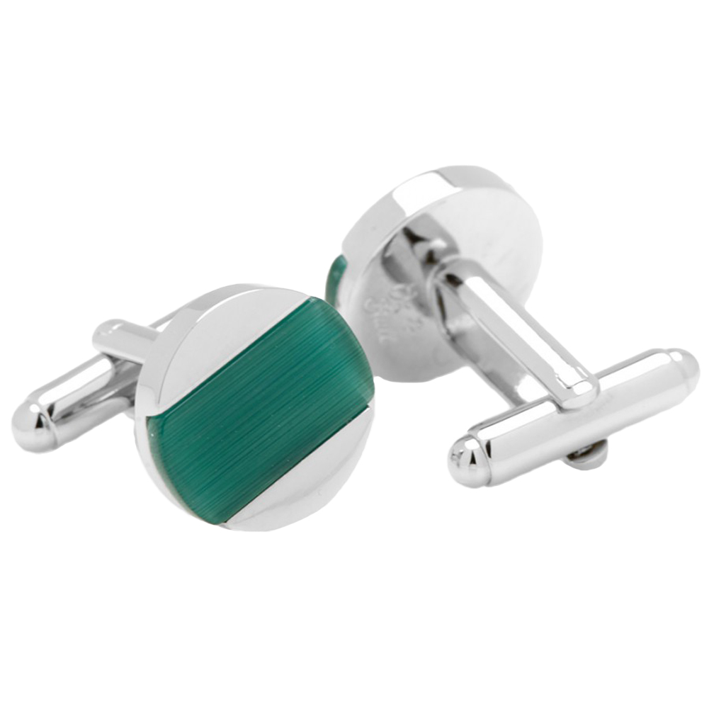 Approximately 5/8" in diameter. silver tone base metal with green cats eye. Bullet back closure