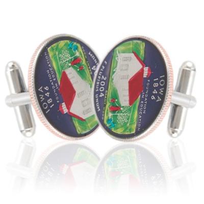 The word lowa is showing the deeply committed to education since its inception. The Iowan Quarter Coin Cuff Links feature is an old-fashioned one-room schoolhouse with the students and teachers outside planting a tree together. The two inscriptions read "Foundation in Education" and "Grant Wood."