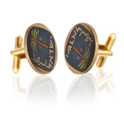 Israel palm tree cufflinks. These unique Israel palm tree cufflinks feature a simple design and a regal color palette made up of deep blue and gold for a touch of stately superiority. This design is modeled in these beautiful hand printed coin cufflinks. Wear these great fashion accessories to all of your special occasions and add a touch of colorful fun to your formal attire. These cufflinks are ideal for both men and women who love the feel of a weighty pair of cufflinks on their sleeves.