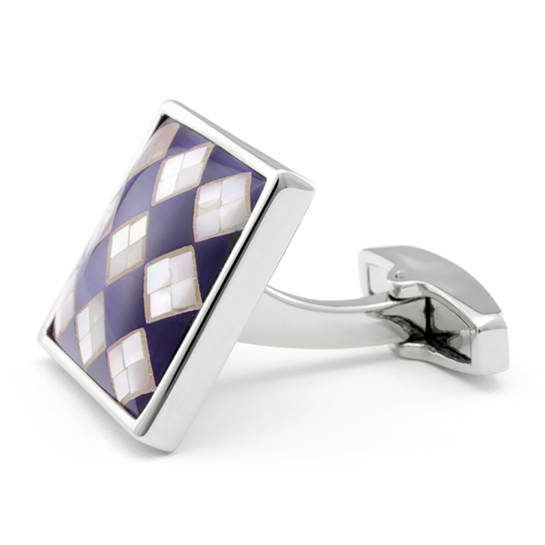 Beautiful cerulean blue Lapis with shimmering Mother of Pearl create harmony aboard each silver-toned cufflink. The familiar pattern is elevated by the intricate detailing and distinctive style that is sure to be noticed by admirers of fine jewelry. Thirty-six small and unique mosaics of Mother of Pearl inlay create nine perfect diamonds atop a surface of intoxicating lapis blue. The geometric shape is echoed by the integrity of the perfectly square link and crisp corners set in polished silvertone hardware. Elegant and modern, the Lapis and Pearl Checkered Cufflinks are a wonderful gift for those who want to give something different to a collector or cufflink connossieur. The color palate also appeals to those just beginning the discover the versatility and utility of high-quality cufflinks.