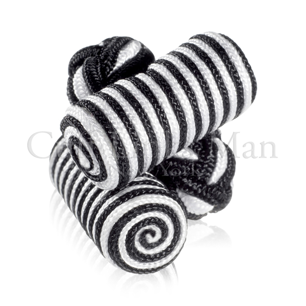 It is a Licorice Black and White silk-knotted log cuff links. Intricately designed in a unique whirlwind pattern. Hand woven, delicately knotted. Manufactured from real silk. Standard size fit all. Silk Knots are packaged - up to three pairs in one presentation box. It is a personalized designer cufflink which is available for men.