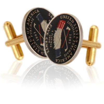 These are a great pair of actual Jefferson "peace" nickels turned into cufflinks. Each coin is hand-painted. The Jefferson "Louisiana Purchase" nickel was minted in 2004 and 2005 to commemorate the bicentennial of this landmark deal.