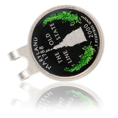 The Maryland quarter depicts the dome of the historic Maryland Statehouse, a building that dates back to 1772. Oak clusters, representing the official state tree, and a state nickname, The Old Line State complete the design for the Maryland State Quarter. The green and white color combination in the black background adds beauty to the hand painted design. This golf marker is not only a useful golf accessory but a great gift idea. Stick 'em up with our fun and functional magnets. Holds refrigerator notes, photos, dress up a school locker, room or workspace. Adds stylish fun to any room. Collect 'em, trade 'em.
