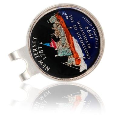 The magnetic New Jersey quarter golf marker is a great gift idea. The New Jersey quarter depicts General George Washington and members of the Colonial Army crossing the Delaware River en route to very important victories during the Revolutionary War. This is beautifully adapted in this hand painted golf marker. Stick 'em up with our New Jersey State Quarter - Fridge Magnet fun and functional magnets. Holds refrigerator notes, photos, dress up a school locker, room or workspace. Adds stylish fun to any room. Collect 'em, trade 'em.