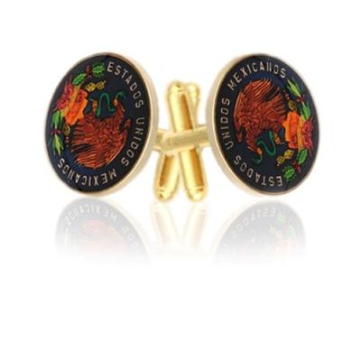The coat of arms depicts a Mexican Golden eagle perched upon a cactus devouring a snake; oak and laurel leaves encircling the eagle cluster; tied together with a ribbon with the Mexican flag's colors. These striking Mexican coin cufflinks feature the coat of arms in hand painted details. This stately design is interesting not only in terms of Mexican history but is a stylish fashion accessory which adds a touch of professionalism to your attire.