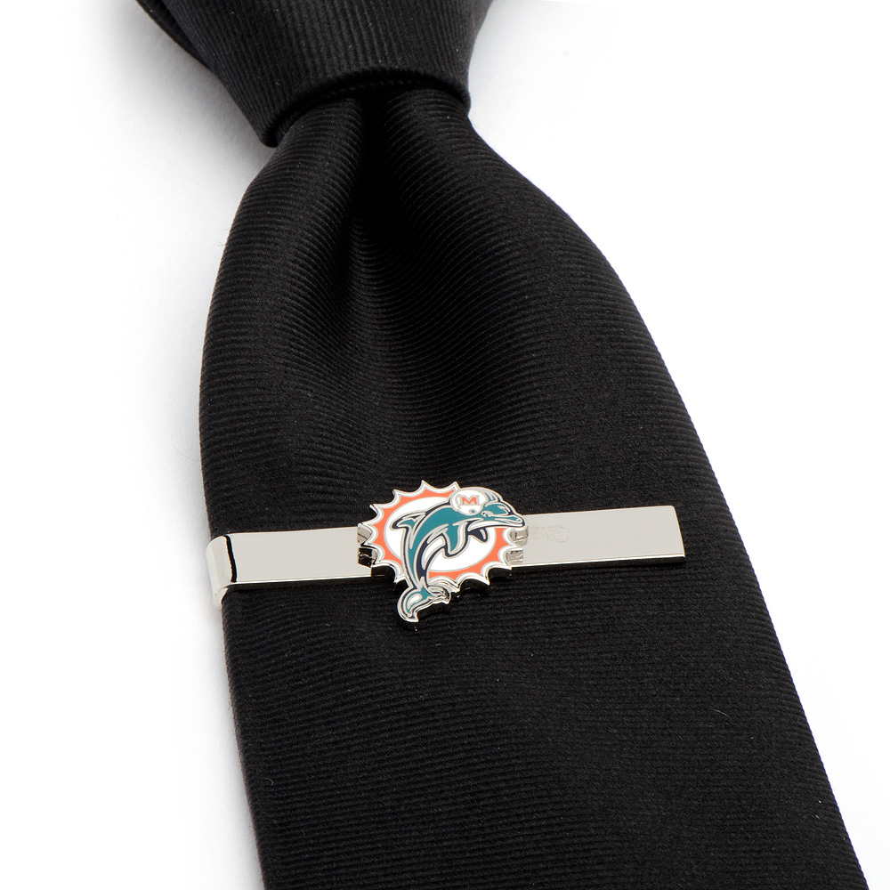 Sport your ties in style by adding the Miami Dolphins Tie Bar. A shiny, rhodium plated sliding tie bar makes it easy to declare your Dolphins allegiance front and center. Officially licensed NFL tie bar.