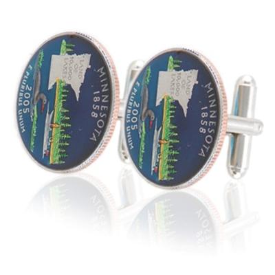 This is a ideal cufflink for the coin collector or state pride enthusiast. This spectacular set features brilliant uncirculated quarters with luxurious platinum-extracted rhodium plating to protect the limited-edition quarters from tarnish, acids and wear. Each set features a rhodium-plated solid brass clasp and includes a certificate of authenticity. It depicts the outline of the state with a background of two friends fishing in a boat on a lake and the inscription, "Land of 10,000 Lakes."