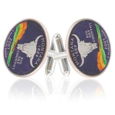This set of Montanan Quarter Coin Cuff Links have been hand soldered and then given a light patina to highlight the image on the coin. Comes in a black velvet bag suitable for presentation. These cufflinks depict a bison skull looming over the rugged landscape with the inscription, "Big Sky Country."