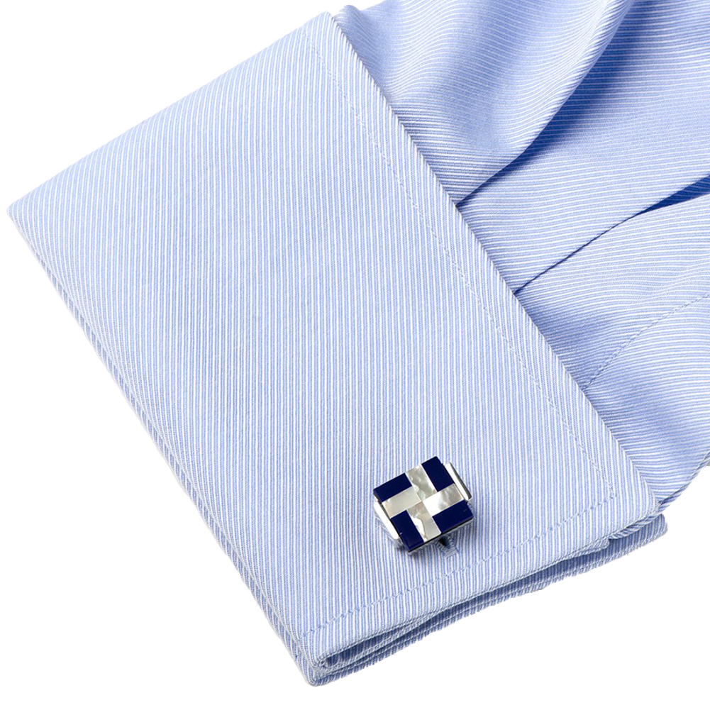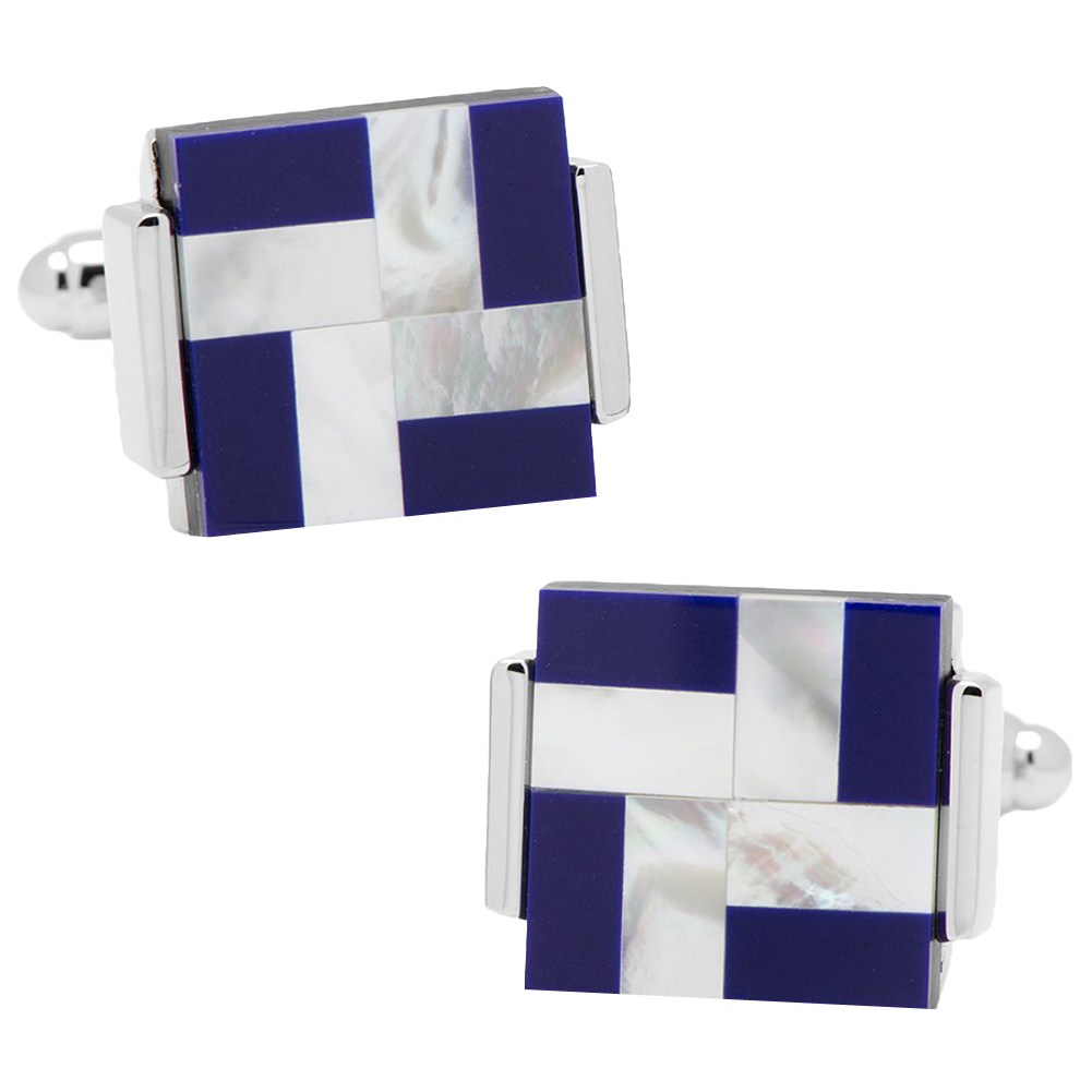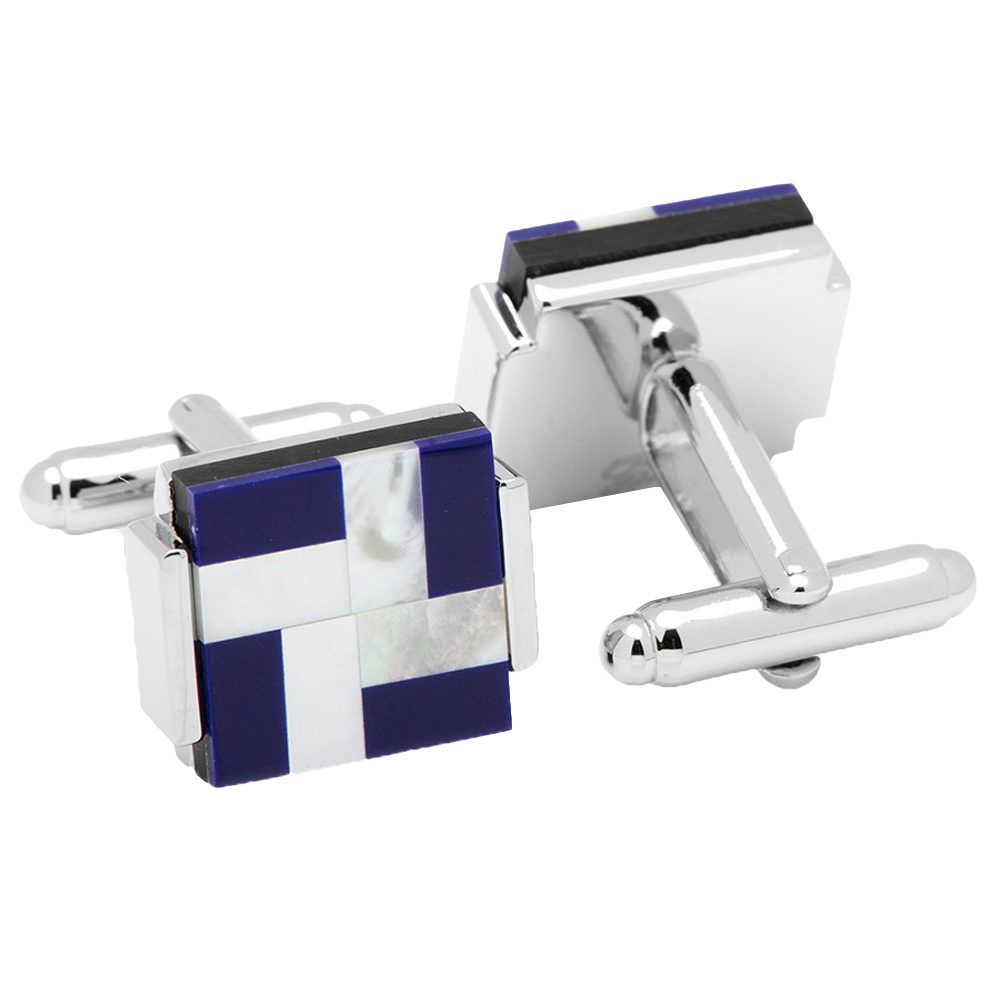 Approximately 5/8" x 5/8". silver tone base metal with Mother of Pearl and Lapis. Bullet back closure