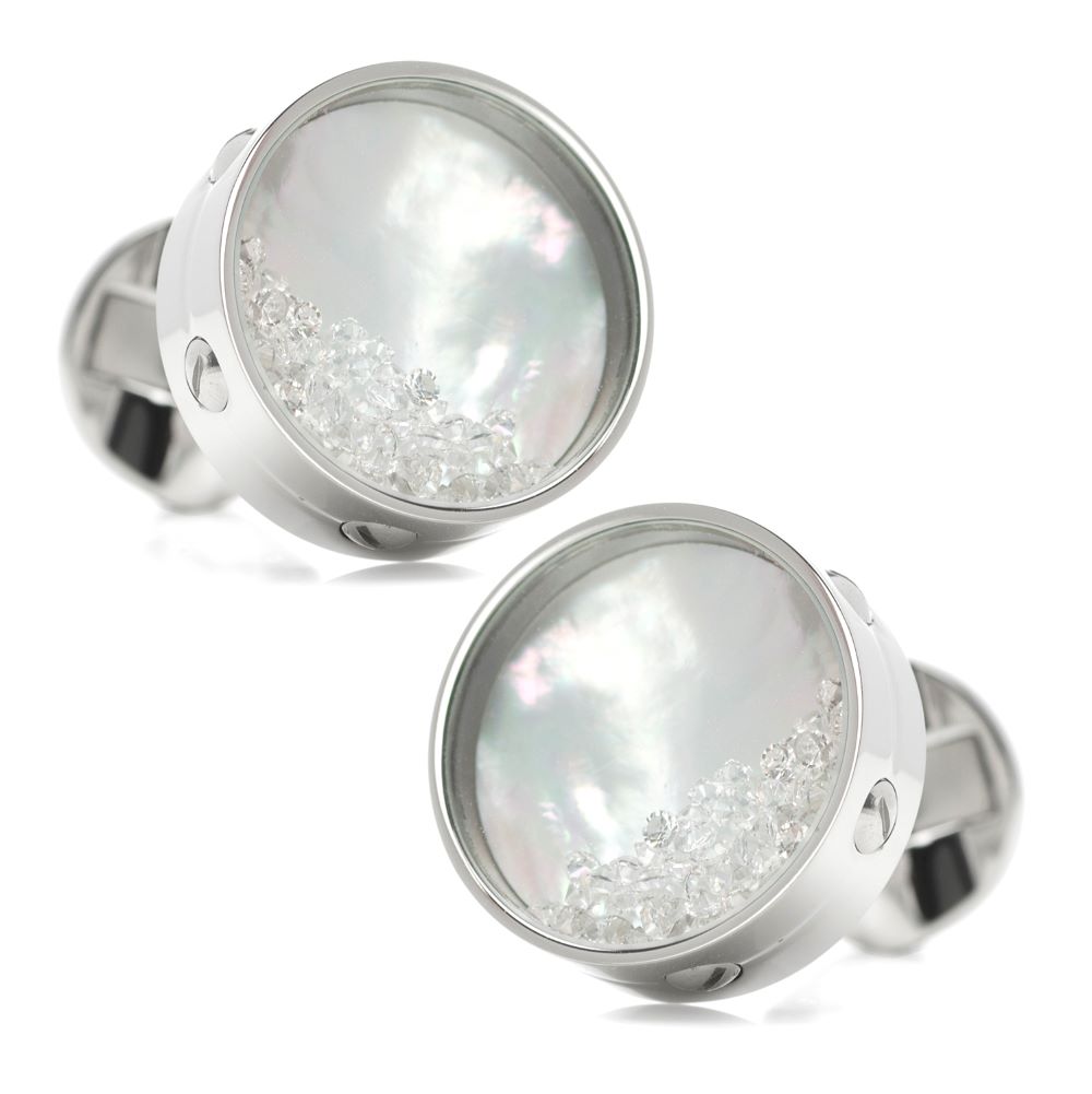 Wear the conversation-starter. These beautiful iridescent cufflinks are sure to catch attention. The mother of pearl face shines through the light-capturing, floating crystals. You will leave a lasting impression on all of those around you.