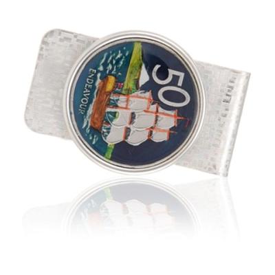 These cufflinks are the original 5c coin of New Zealand shows the HM Bark Endeavour, the Royal Navy research vessel on the voyage of discovery to Australia and New Zealand from 1769 to 1771. Mount Taranaki, an active stratovolcano in the Taranaki region of New Zealand is shown as the backdrop. The ,surprising image on this coin was highlighted and brought to life in this hand painted money clip. You would be proud to own or gift this stunning money clip.
