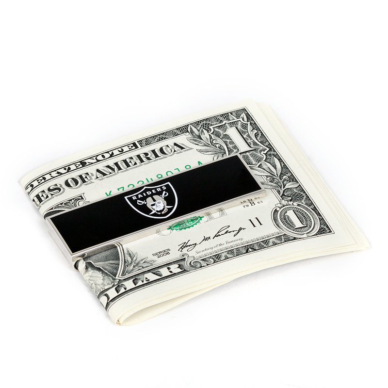 It is Oakland Raiders Money Clip. To get a gift for a football fan can be tricky. The NFL money clip and pen set from Team Sports America is sure to put a smile on your favorite fan's face. The genuine leather money clip boasts a credit card slot and is decorated with the full-color team logo, while the pen features the team logo and a comfortable grip. It is personalized money clip designed for men.