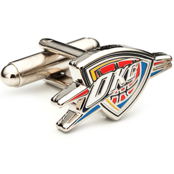 These cufflinks is the perfect gift for the sports lover in your life, a pair of officially licensed Oklahoma City Thunder Cufflinks. Ideal for the fashionable fan, support your team in the most sophisticated of ways. The official logo of the Oklahoma City Thunder for your workweek wear. Formerly the Seattle SuperSonics, now you can sport the new OKC Thunder even on the days when painting your face is simply not an option.Approximately 3/4" x 3/8"Rhodium plated base metal and enamelBullet back closure .
