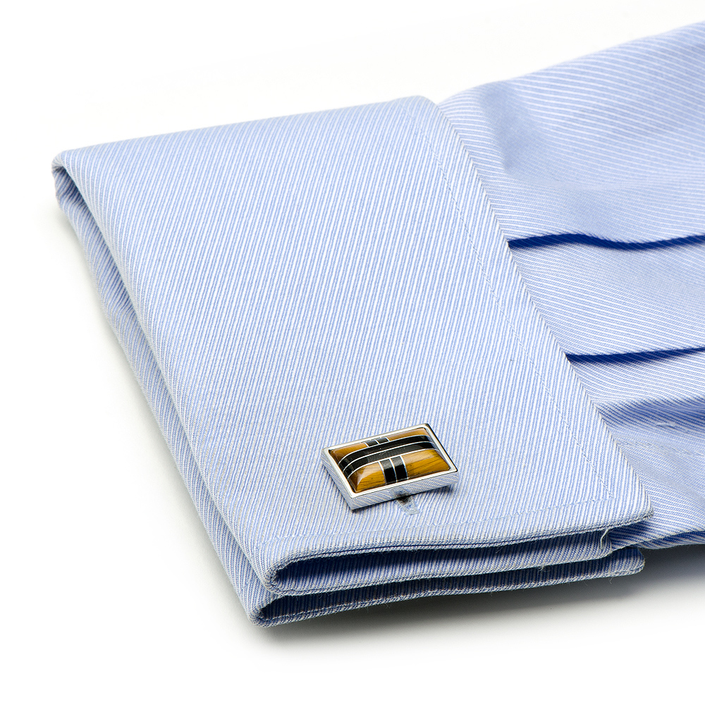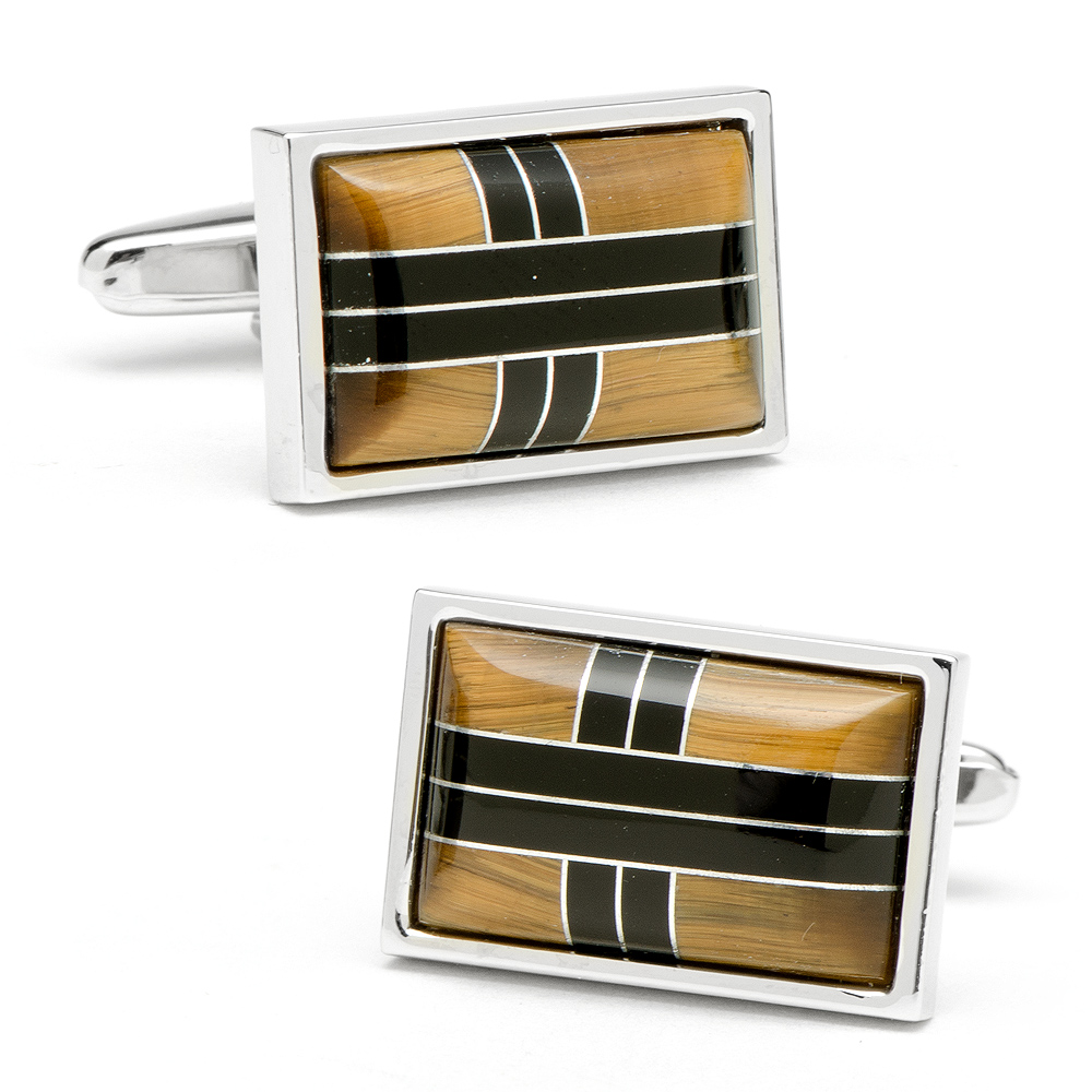A classic mix of black Onyx stone and yellow Tiger eye framed in a highly polished rectangle silver surround.A timeless design, these cufflinks are a perfect present for business wear and formal attire. Supplied gift wrapped in a Men's Gift Company presentation box. It is uniquely designed and New York fashion inspired.Finished with an edge of sliver plated. It has a exceptional precision. Hand polished. Size:7/8" x 1/2"
