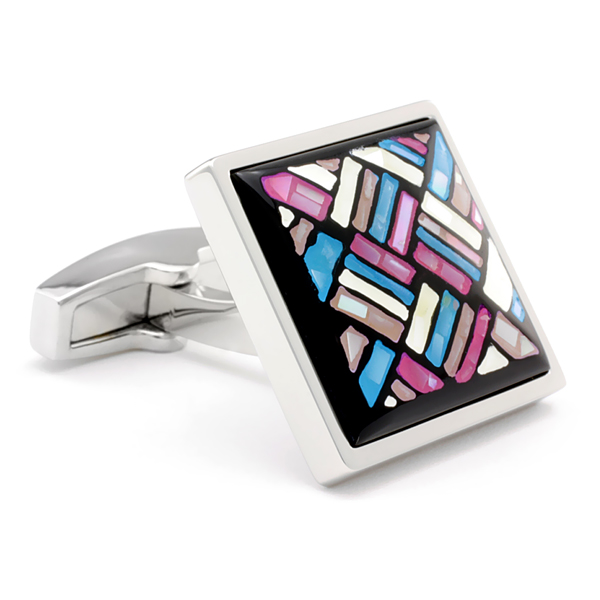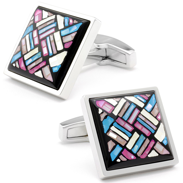 The Optical Spring Weave Stone Inlaid Cufflinks feature a unique and fresh color pallette for the wearer- the shimmer of Mother of Pearl highlights a mosaic of blue, pink, ivory, and taupe. The fresh color and crisp border in black Onyx give a clean finish to the cuff. The glimmer of the silvertone setting frames the mosaic which replicates a familiar woven style pattern. The silver is echoed with a sturdy backing and fixture for easy and secure wear. Glossy and bright, these cufflinks will be an innovative addition to a collection or to accent a look for an upcoming event.