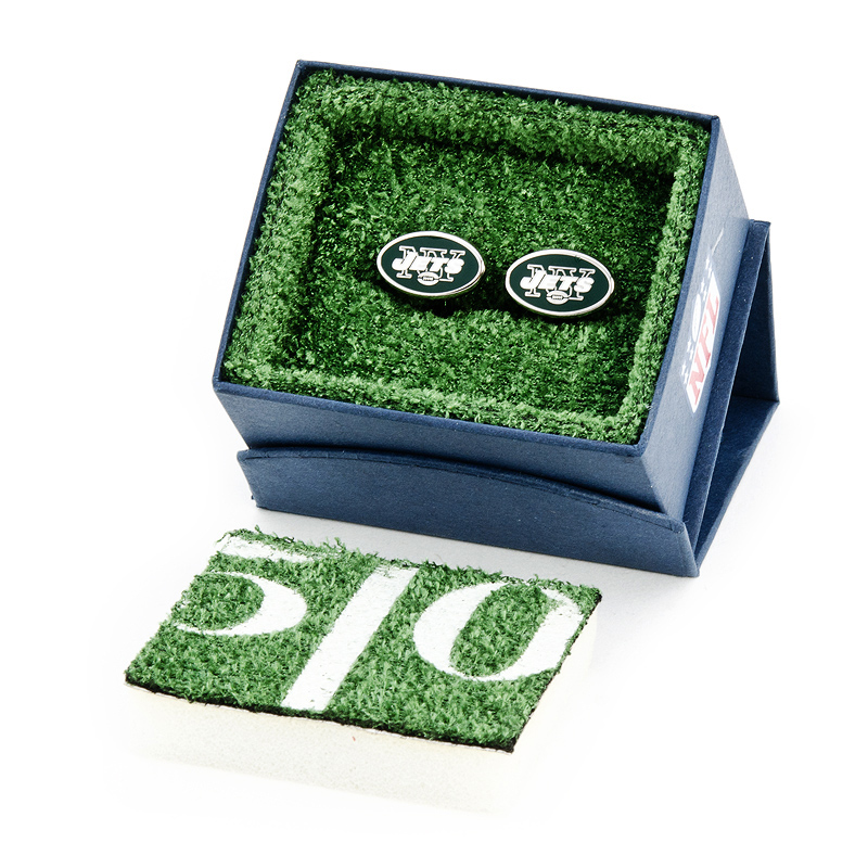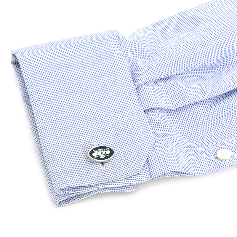 Like Broadway Joe himself, the Palladium New York Jets Cufflinks are the epitome of fashion in sports. Expertly constructed on a fixed backing, the Cufflinks are double sided and made with an ultra luxurious platinum finish and enamel accent. This version is double sided and made in Enamel Finish with palladium plated silver tone accent. Cufflinks represent the official of the New York Jets. Back side features the NFL logo. Officially licensed NFL. Approximately 3/4" x 1/2" with One piece, fixed backing.