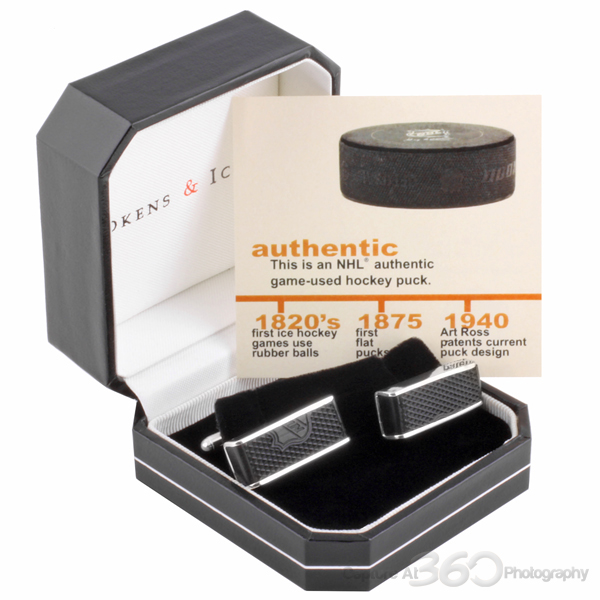 This unparalled set of cufflinks is made from an authentic NHL Rangers hockey puck used in an actual past Ice Hockey game. Our "Pick Your Puck Again" Cufflinks are the real deal, which means they are made from the flat, black disk-shaped vulcanized rubber pucks used in today's modern sport. Did you know that in 1875 the rubber balls originally used on the ice were converted to a flat shape? Just a little trivia for you. With each Token and Icon purchase, we also include a Certificate of Authenticity.