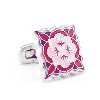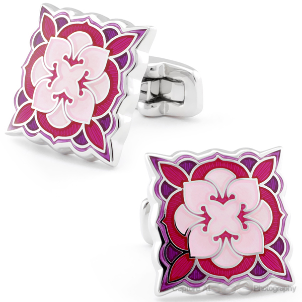 Intricate design to compliment your shirts, these Pink Blossom Flower Shield Cufflinks will pop on your cuffs with it's unique design. The square cufflinks feature a light pink blossoming flower over a larger rose pink blossoming flower over a purple background. The unique ridged edge create an impression of an actual blossoming flower on your sleeve. Compliments red, pink, and dark colors, a great addition to your collection.