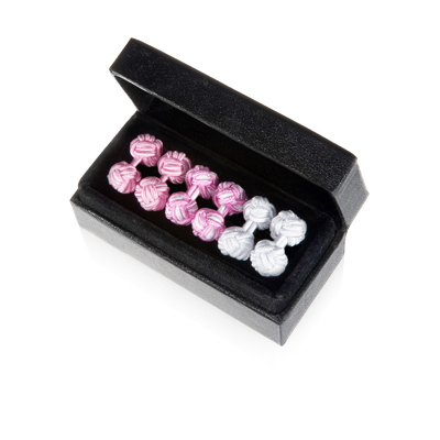 It is Pink & pearl trio of silk knot cuff links. As it is Hand woven, delicately knotted. Manufactured from real silk. Standard size fit all. Black felt keepsake box included. Silk Knots are packaged - up to three pairs in one presentation box. It is personalized designer cufflink which is available for men.