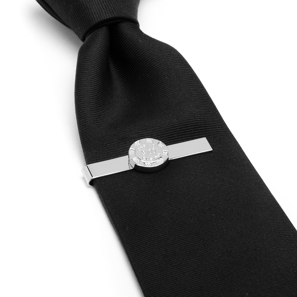 It is Poker Chip Tie Bar. Approximately 2" x 3/8" with Sliding Tie Bar.