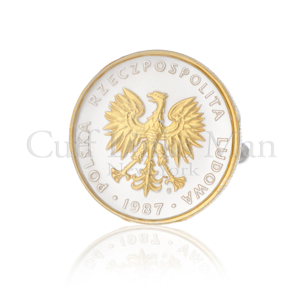 This real coin from Poland, the size of a U.S. quarter, is first layered in pure bright silver. Then, by hand, the figure is highlighted and brought to life with rich, pure 24K gold. This breathtaking work, done exclusively by J & J Jewelers, turns the coin into a stunning and true work of art. This breathtaking and exclusive work turns these coin into stunning and true works of art. Each coin is hermetically sealed against wear in clear, hard acrylic coating. The coin is the size of a U.S. quarter. They might also ask you if you’ve ever been to Poland, or if you are of Polish decent. As you can see, these Polish 5-Zlotych Eagle coin cufflinks are an excellent conversation piece. The next time you head out to a formal affair and you want to make a lasting impression, put on a pair of Polish 5-Zlotych Eagle coin cufflinks. You’ll be remembered for your originality as well as your charm. That is, if you are charming.