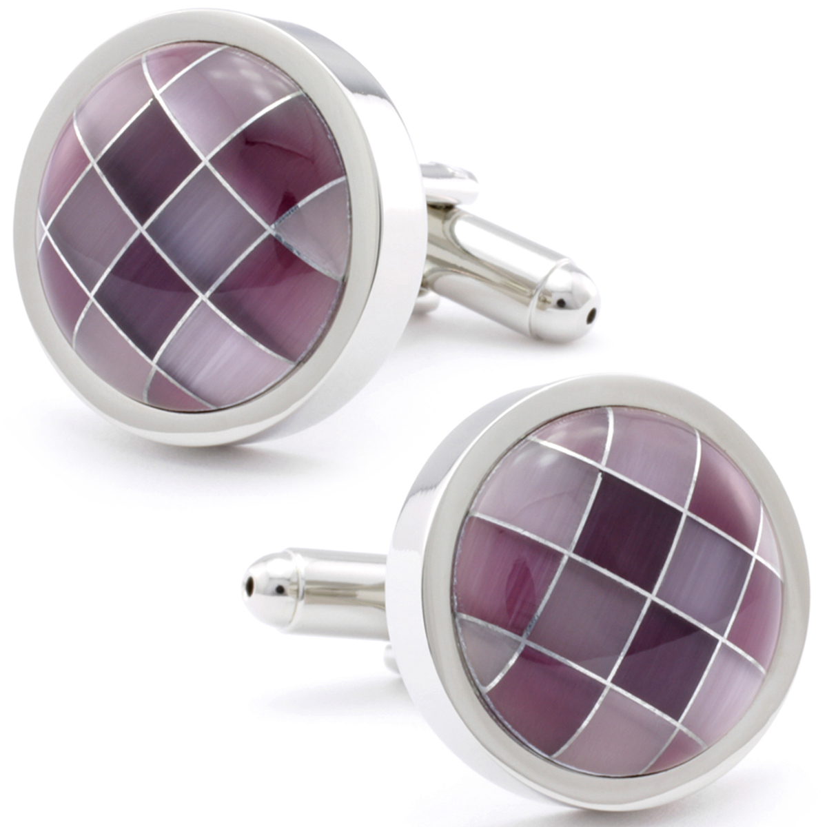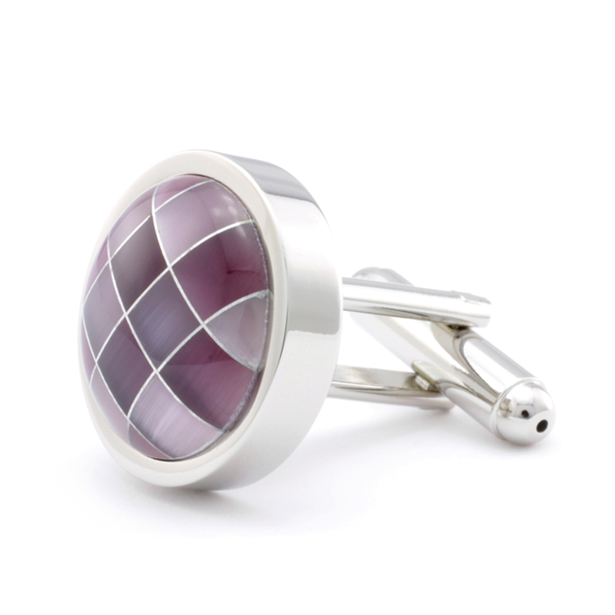 The Classic & Cool Cufflinks. These Cufflinks features Silver plated metal base with cat's eye, Bullet back closure. These cufflinks are the perfect accessory for the well dressed man. Purple cat's eye stone is perfect for adding personalization. Presented in a beautiful gift box