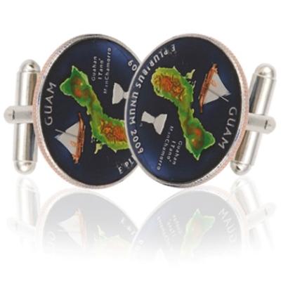 These cufflinks design features an outline of the island, a sailing vessel called the Flying Proa, and a Latte used as a base for homes. The Chamorro is one of the official languages of Guam. Its usage is seeing a renaissance in modern times and provides a link to their ancestors.