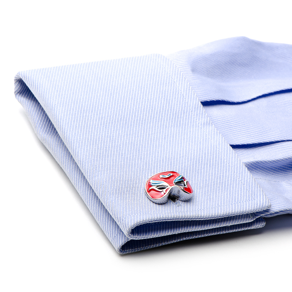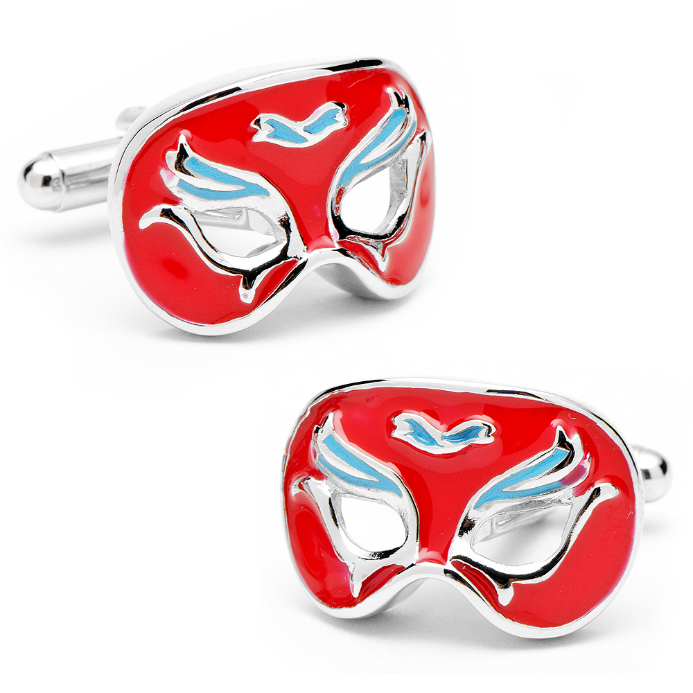 Red and Blue Mardi Gras Venetian Mask Cufflinks Make a great addition to your wardrobe. Each cufflink measures Approximately 3/4" X 1/2" are enamel and plated base metel and have bullet back closures. Design by CufflinksInc.