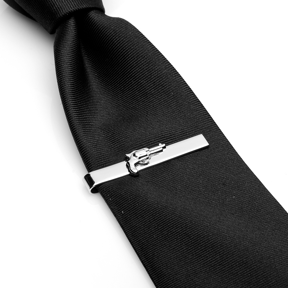 This shiny silver Revolver Tie Bar measures in Approximately 2" x 7/8" in diameter with Sliding Tie Bar. Tie Bar design by Ravi Ratan.