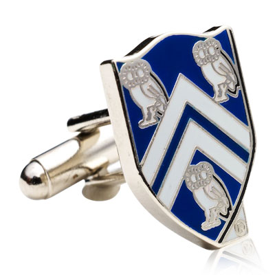 These cufflink is enameled shield on these three-fourths inch by three-fourths inch cufflinks is taken from the University seal. Three owls and two chevrons are rendered in silver and white on a deep blue ground with a silver-plated backing. he official logo of the Rice University Owls. Rice University cufflinks are the perfect way to display your school spirit. - Approximately 3/4" x 3/4" - Silver plated and enamel - Bullet backing.