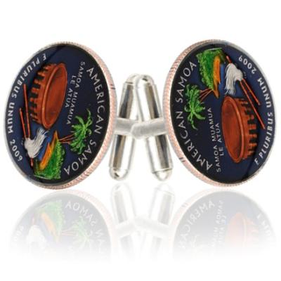 These Samoa Quarter Coin Cuff Links is the skin tone the ava bowl, which is used to make a traditional drink in traditional ceremonies, and the whisk and staff, symbolic of the rank of narrator. The locale displays the seaboard and coconut trees. An inscriptions reads SAMOA MUAMUA LE ATUA (Samoa, God is First).