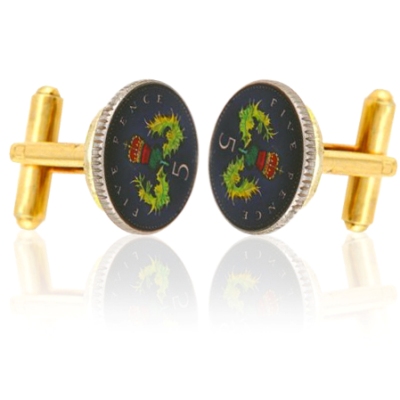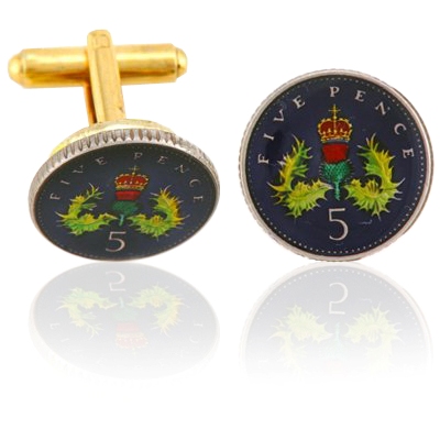 Let these Scottish coin cufflinks add a touch of historical spice to your sleeves. The design of the original reverse of the 5 pence coin is a crowned thistle with the numeral "5" below the thistle. It is beautifully hand painted to perfection in this cufflinks. This will surely help to get you noticed when you casually wear them around the office or to business meetings.