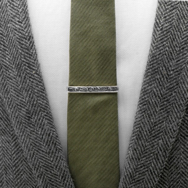 Approximately 2" x 3/8". Antique plated base metal. Hinge back closure.
