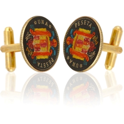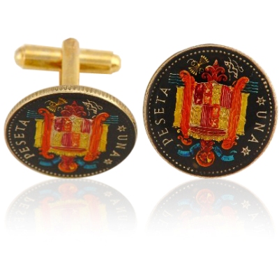 The Spanish' coat of arms symbolizes in the shield, the old kingdoms of Spain; the crown, the Constitutional monarchy and the supporters, the Spanish geographic situation. The Pesata coin of Spain features the coat of arms which is hand painted on this coin cufflinks. Wear this colorful cufflinks to create a stately look to formal outfits.