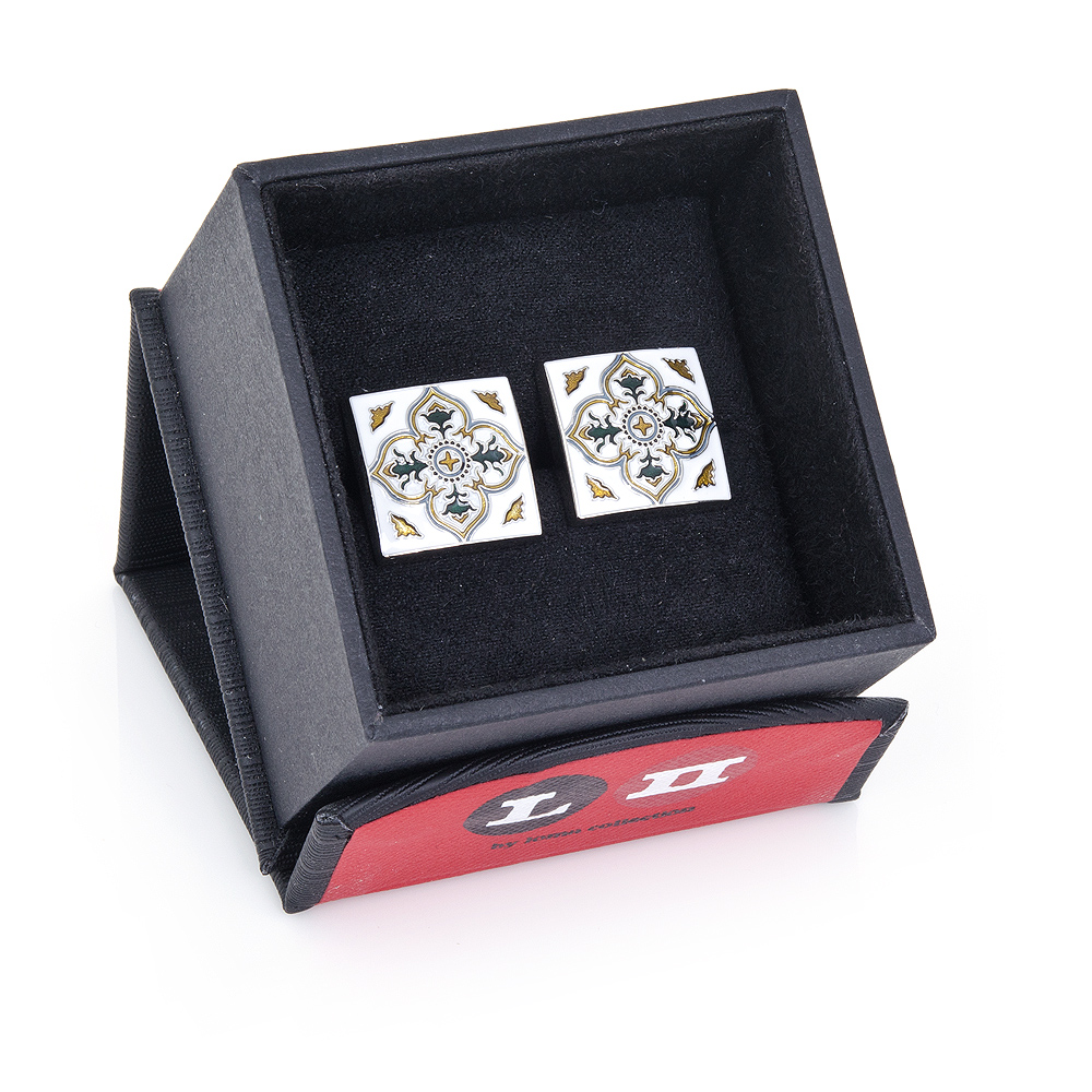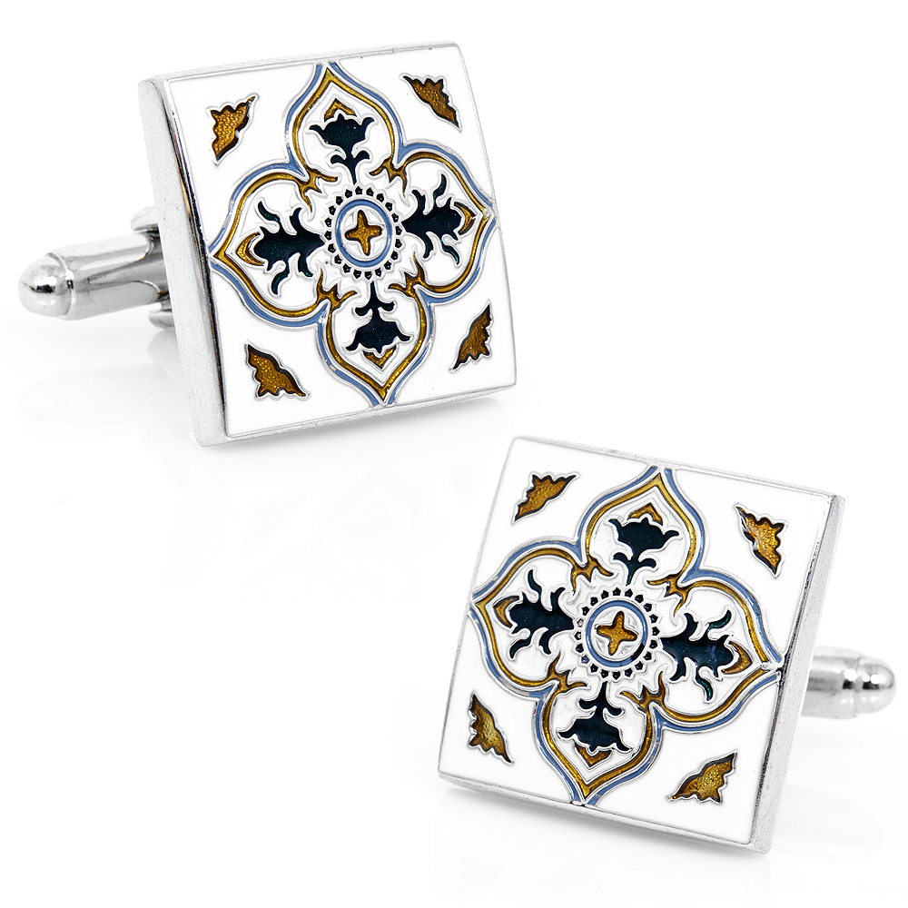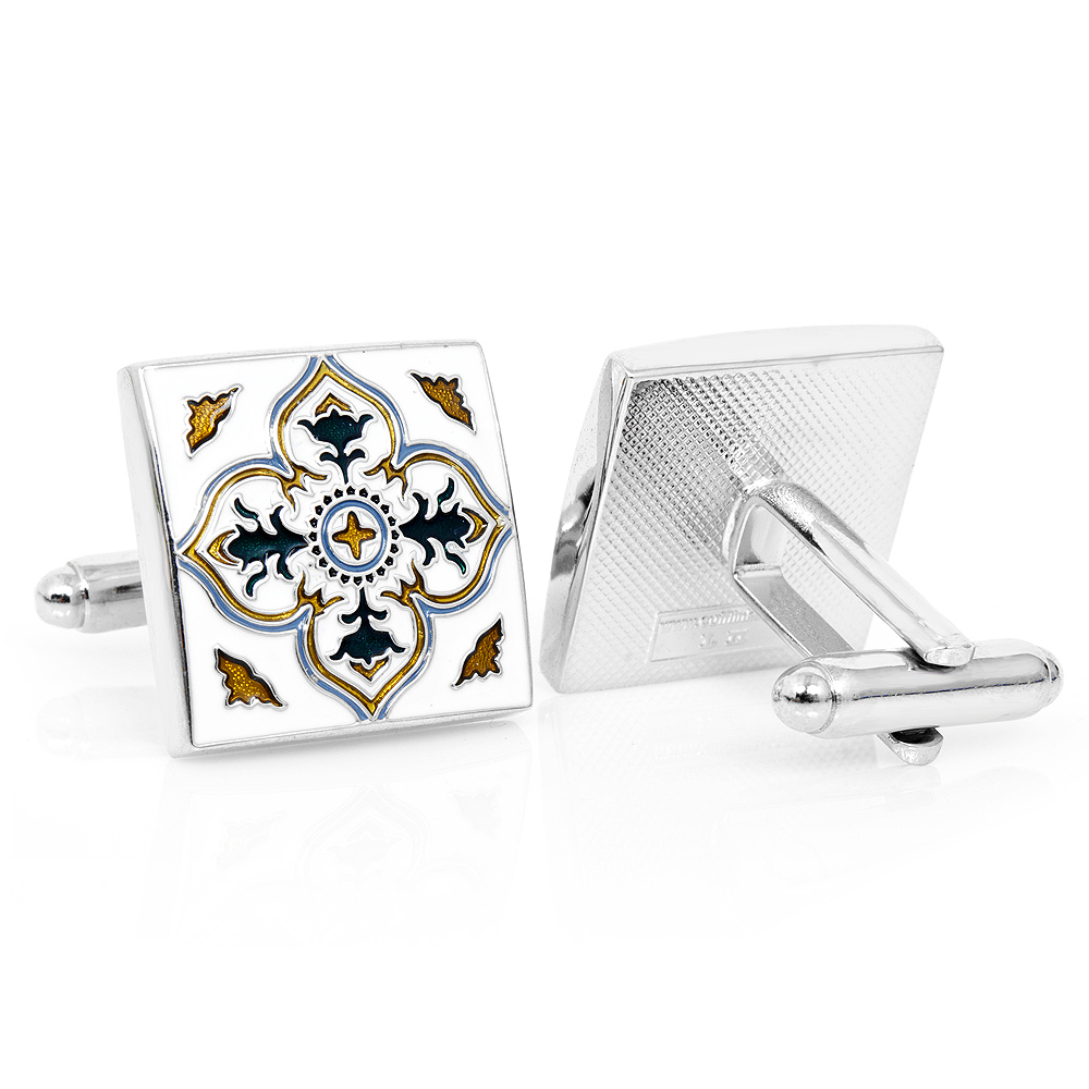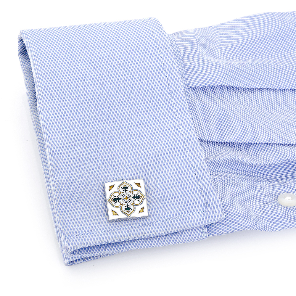 Inspired by the texture, colors and design elements, Spanish Tiles Cufflinks represent the kitchens, fountains, and facades that are decorated by a handcrafted art that dates back to the late 16th century. Set in sterling silver and intricately enameled with rich hues of blue, green and brown and set on a white background. Cufflinks by LOMA Collection. - Approximately 3/4" x 3/4" - Sterling Silver and enamel - Whale backing