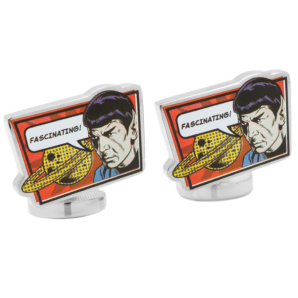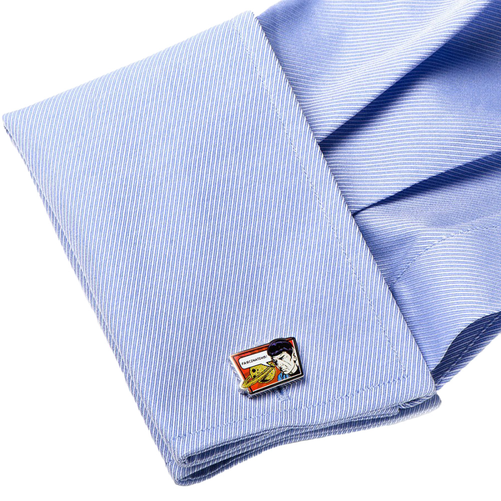 No emotional robot or hyper-efficient ex-Borg can ever replace Spock in our hearts. Wear your Trekkie pride with the officially licensed STAR TREK Spock Fascinating! Cufflinks. Cufflinks are silver tone with a comic printed image and ship in official Star Trek licensed packaging that is ideal for either storage or display.? Approximately 3/4" x 3/4". silver tone with enamel. Fixed back closure. Officially licensed by CBS Studios, Inc.