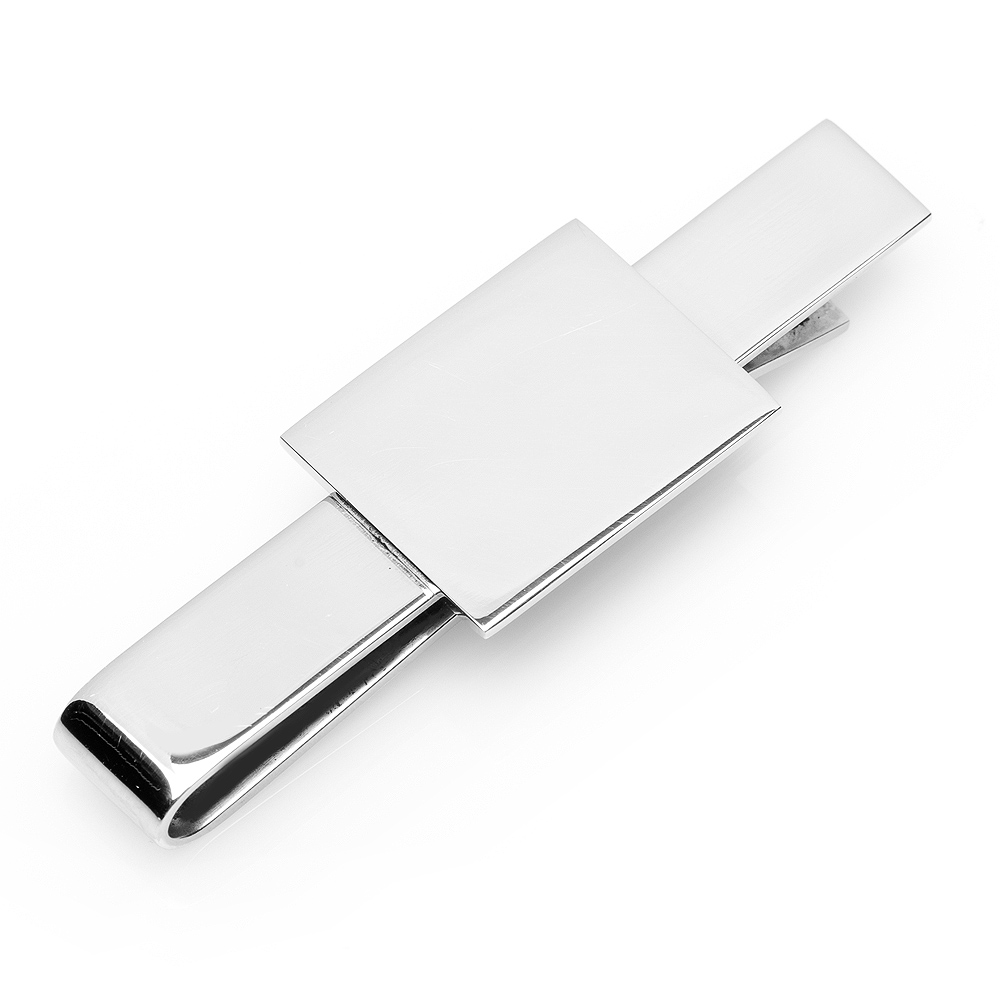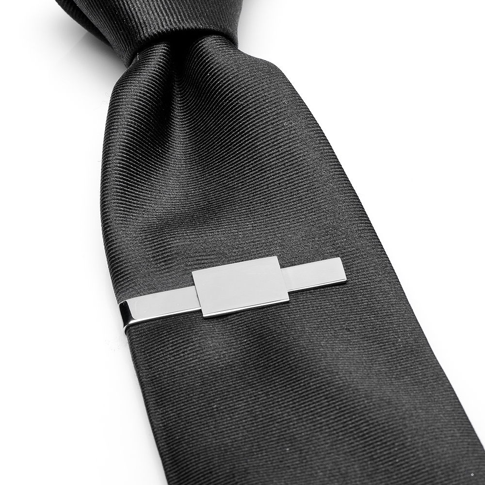 This shiny silver Stainless Steel Rectangular Infinity Tie Bar measures in Approximately 2" x 3/8", engravable face approximately 3/4" x 5/8" with Sliding Tie Bar.