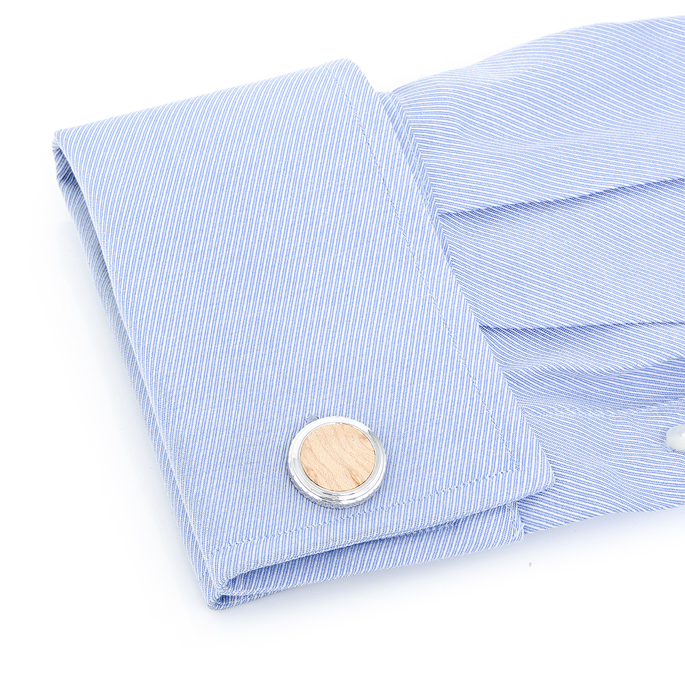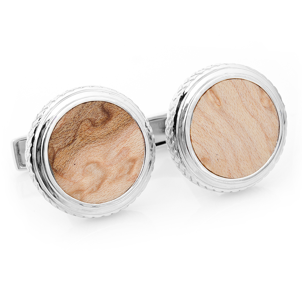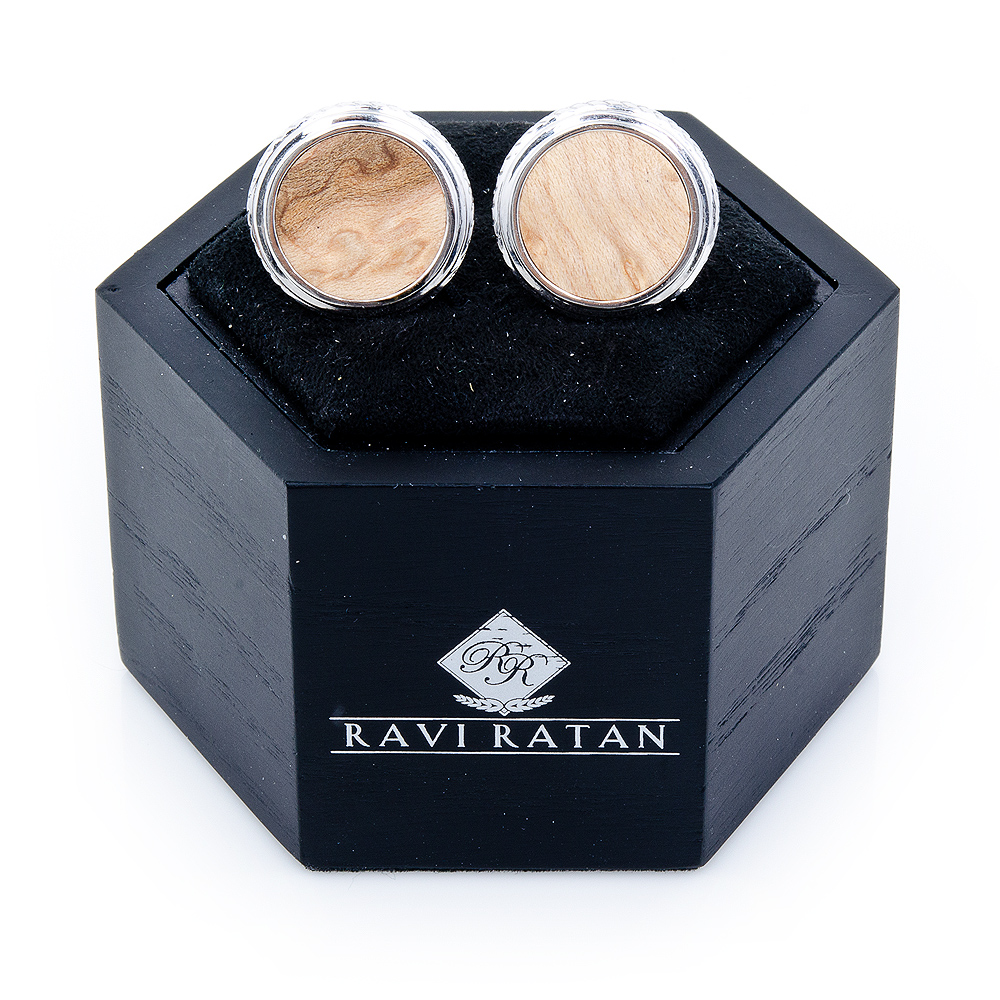 Sterling Silver And Birdseye Maple Wood cufflinks are Engravable whale back closure and have 23g(.8oz) Total Pair Weight. Design by Ravi Ratan.Presented in a stylish branded black gift box.