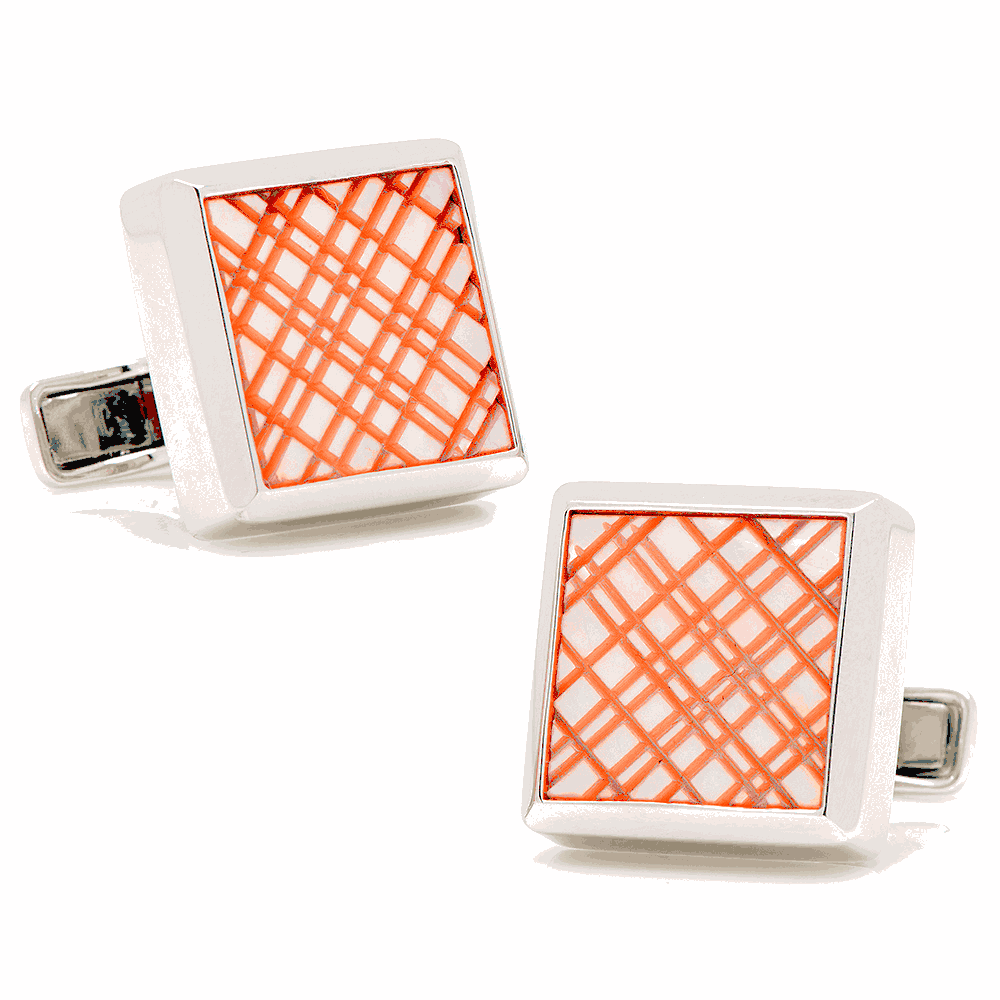 These orange etched plaid cufflinks are approximately 7/8 by 7/8 inches with laser-cut mother of pearl for precision and engravable whale back closure for customization. The plaid pattern adds charm to the design while the citrus color adds a burst of fun flavor. This combined with the elegance of the mother of pearl creates a balanced and tasteful look.