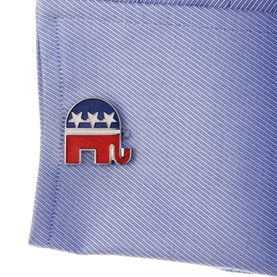 The stylized Republican elephant proudly wears the red, white and blue in enamel on a sterling silver backing. We ship to “red” states, “blue” states and “purple” states without favoritism. Classic GOP elephants in brilliant red, white, and blue enamel on a sterling silver cufflink. - Approximately 3/4" x 3/4" - Enamel and sterling silver - Straight post, whale backing