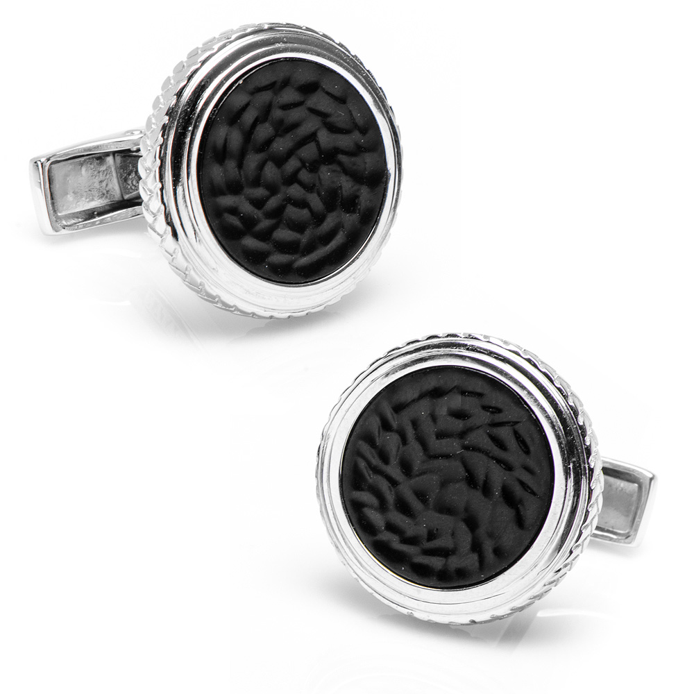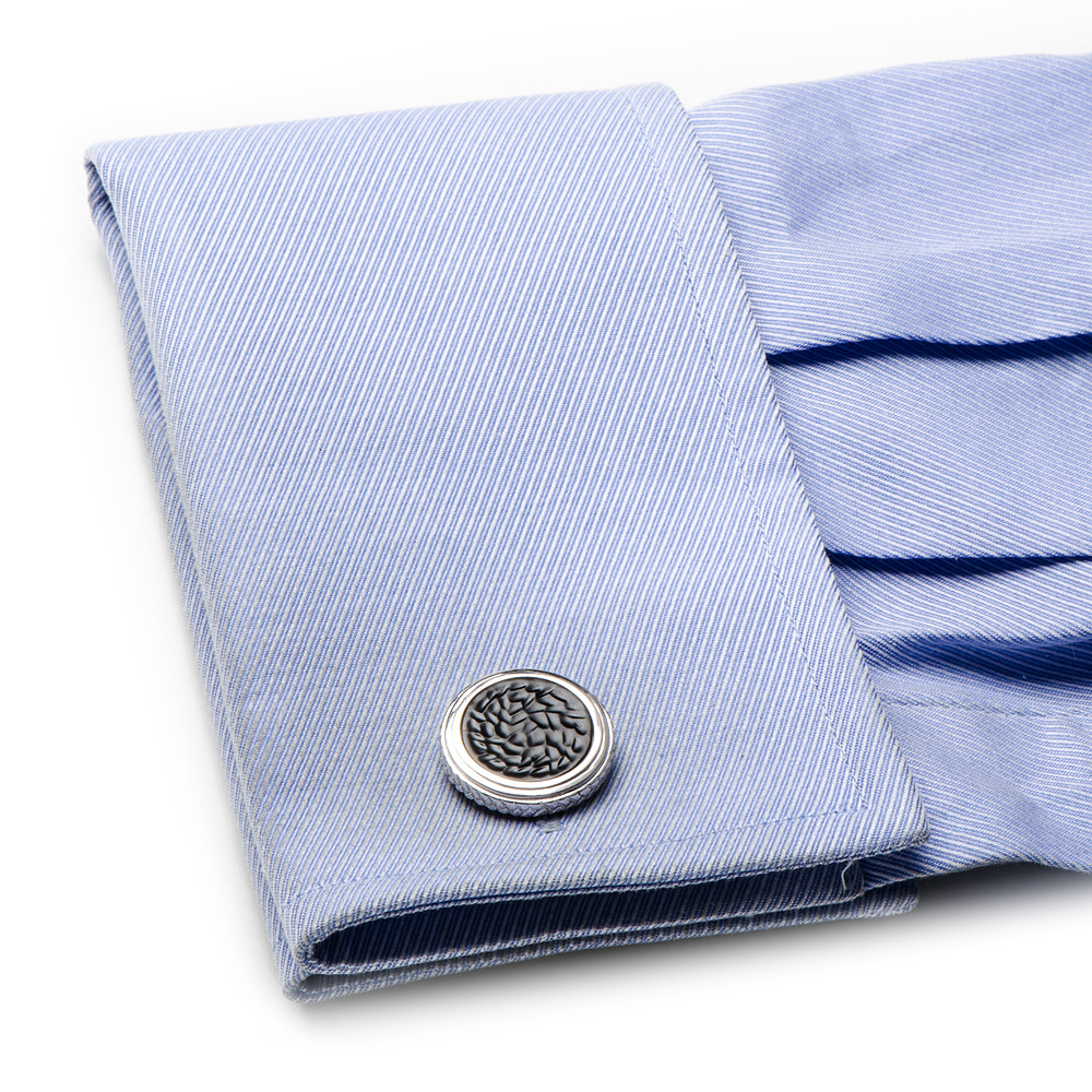 Opus cufflinks are made with a classic, round-cut hammered black centerpiece. The stones are hand set in a thick woven patterned sterling silver frame. The detail is so immaculate, you'll love them as much on your counter as you do on your cuffs.Get them engraved for added personalization or to commemorate a special occasion.Cufflinks by Ravi Ratan.