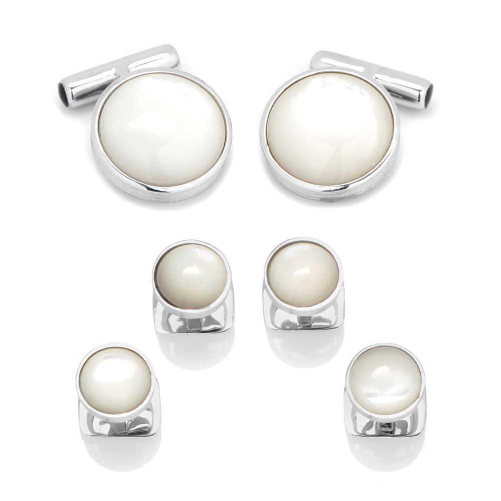 Understated, yet impactful. Opulent, round mother of pearl is set in polished sterling silver with ribbed sides. The cufflinks feature a chain link back for a vintage style. Specifically designed for the classy man, the quality and attention to detail in this stud set makes it a reliable go-to for any occasion.