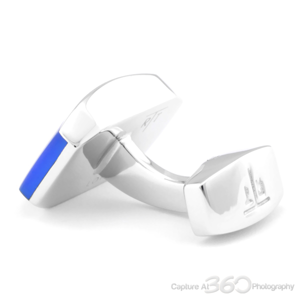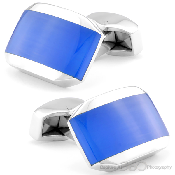 Elongated hexagonal cufflinks have tapered corners with central section of flush inlaid fibre optic glass. Rhodium plated.