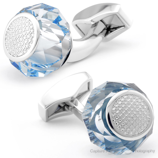 The faceted Swarovski Element ball has a drilled hole in the middle which enables it to spin around the middle axis, creating a fun and interactive cufflink. The top part of the cufflink has the Tateossian signature diamond pattern deeply stamped onto the metal.