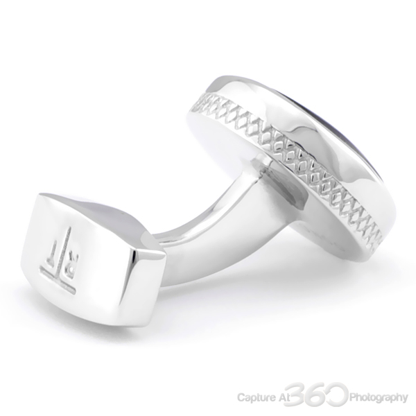 Fibre optic glass cufflinks set with flush inlay technique to create a clean and polished finish. It has the Tateossian signature diamond pattern running around the edge. Available rhodium plating