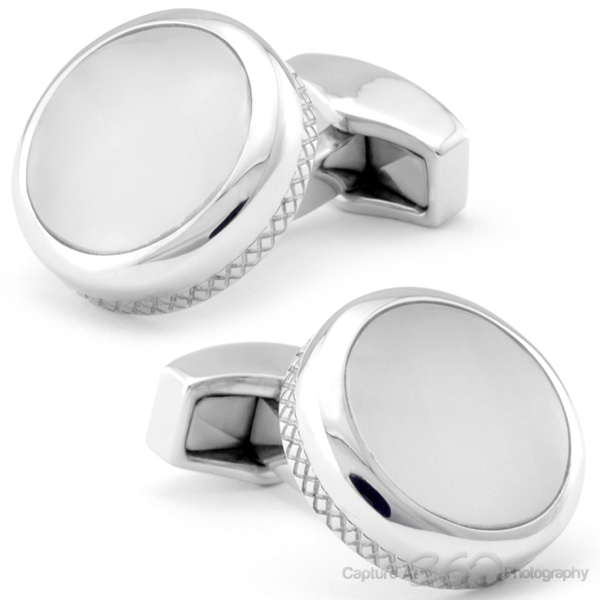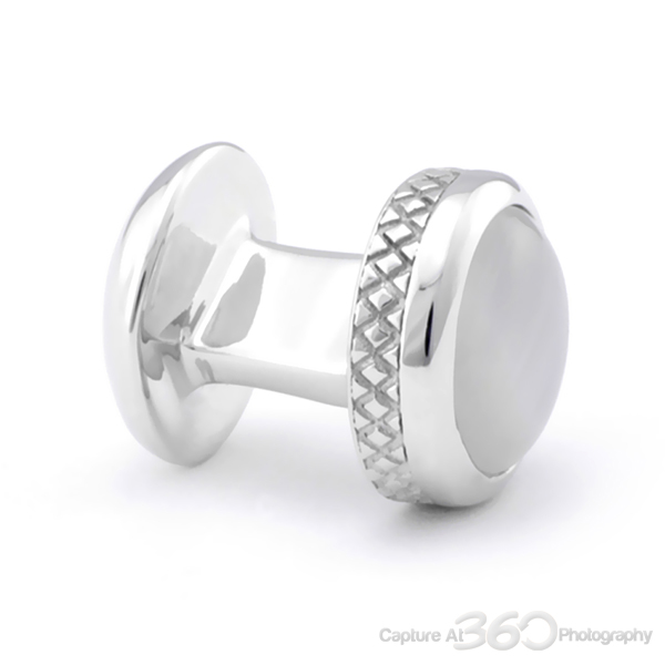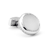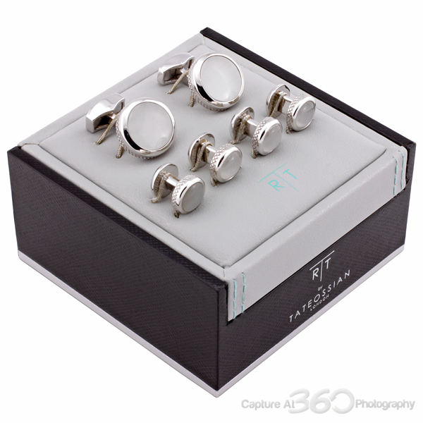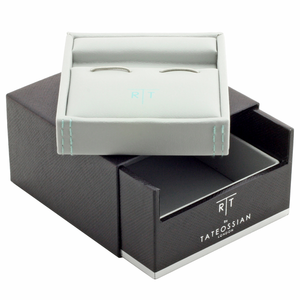 Fibre optic galss cufflink set with flush inlay technique to create a clean and polish finish .It has the Tateossian signature daimond pattern running around the edge.Available in white fibre optic glass all with Rhodium plating.