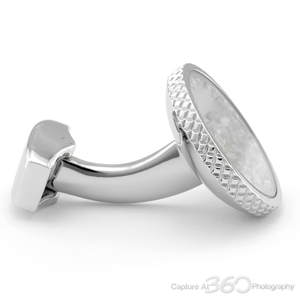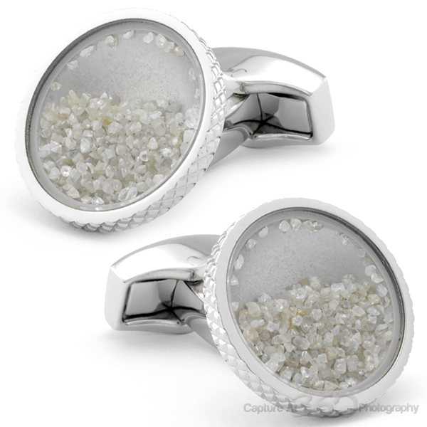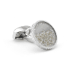 Precious and sparkling genuine diamond dust is captured under glass to create a unique cufflink for that very special person. This is a striking and beautiful cufflink which reflects the Tateossian manner of using precious materials in unusual ways. Each pair of cufflinks contains 3 carat of diamond dust. It has the Tateossian signature diamond pattern on the case.