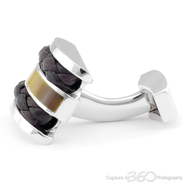 This D-shaped cufflink has a cut-out groove to accomodate the braided italian leather and a middle panel with a flush inlay of fibre optic glass. This design reflect Tateossian's innovative way of combining unexpected materials. Aavailable in black and brown leather with sage, fibre optic glass. Rhodium plated.