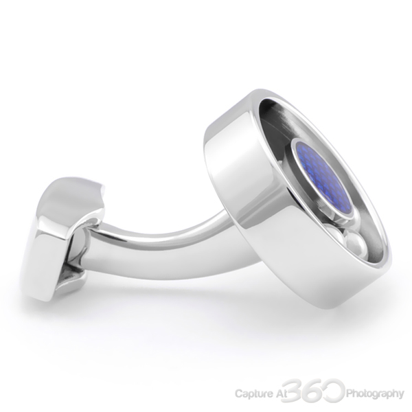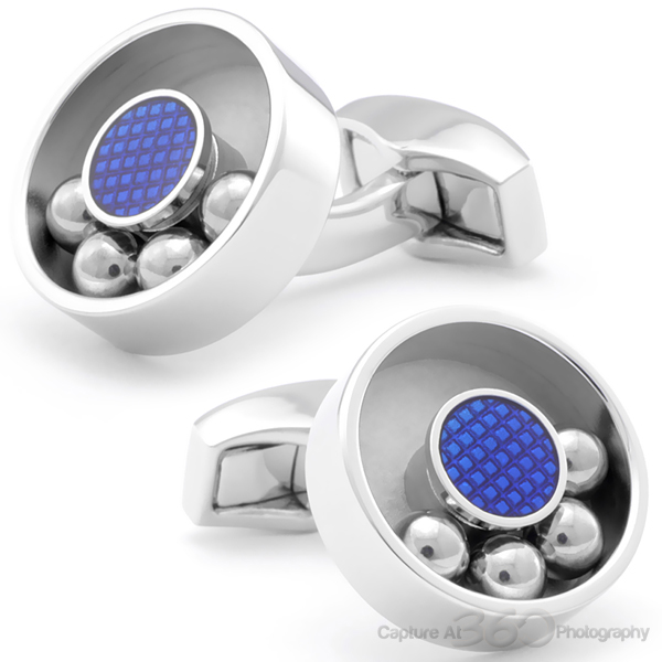Roto moto is a fun interactive cufflink. The round case consists of four smooth metal ball bearings that roll around the base of the cufflink, the cufflink has a lip which enables the top to be uncovered while the balls are free to roll without coming out of the case. The middle column has the Tateossian signature diamond pattern stamped onto the metal which is then covered with a layer of enamel. Available in Rhodium plated
