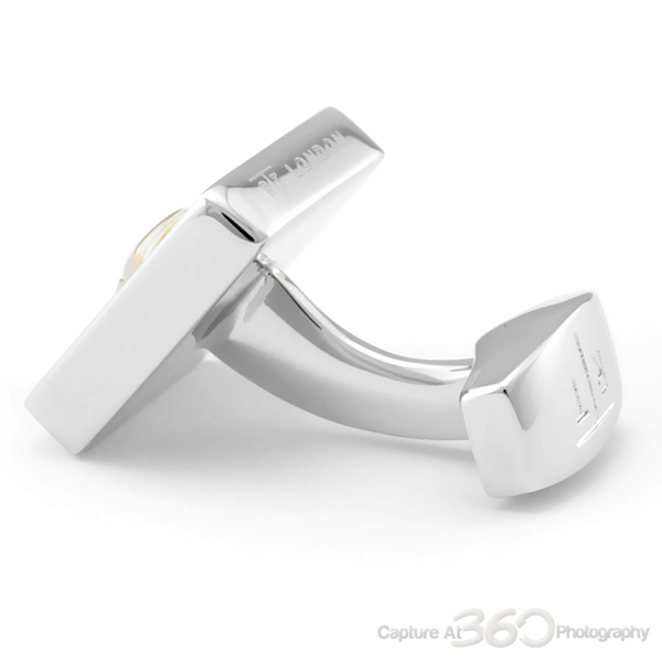 his collection is made up of twelve different sporting activities. Each design consists of the Tateossian signature diamond pattern covered with charcoal enamel and a raised yellow gold colour plated rotating element. All the designs are interactively moveable and symbolise a famous sporting activity. Rhodium plated case with spinning element plated in yellow gold colour.